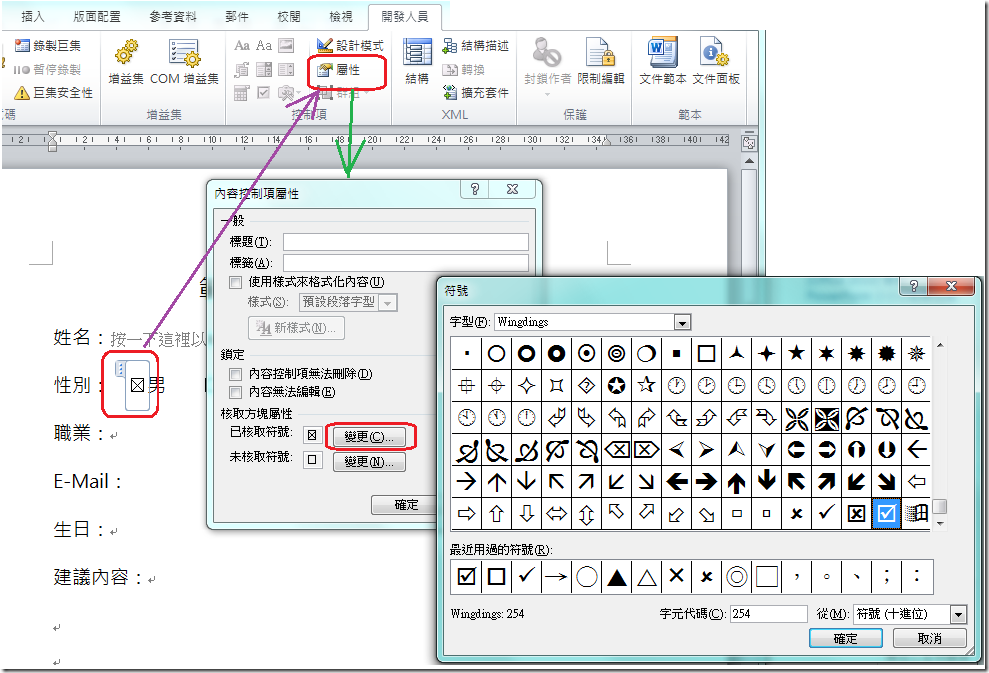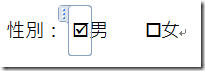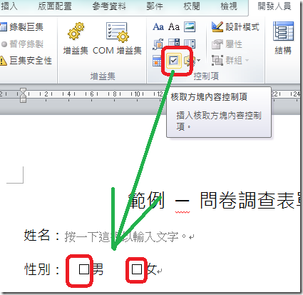 4. 請分別在男 & 女前面點選插入 「 核取方塊內容控制項 ( CheckBox Content Control )