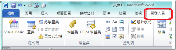 1. 開啟 Word 2010 並選擇 [ 開發人員 ( Developer ) ] 。