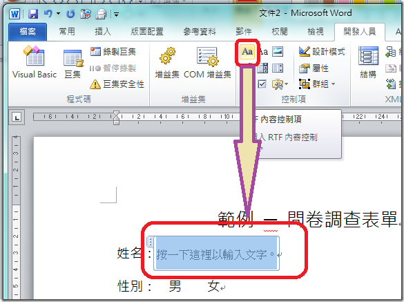 3. 在姓名中插入 「 RTF 內容控制項 ( Rich Text Form Content Control )