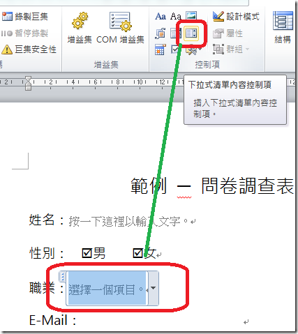 6. 在職業中插入 「 下拉式清單內容控制項 ( Drop-Down List Content Control )