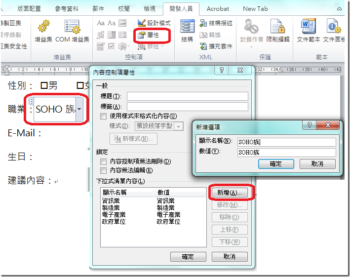 7. 同樣地按下 [ 屬性 ] / [ 新增 ] ,即可建立下拉式清單內容。