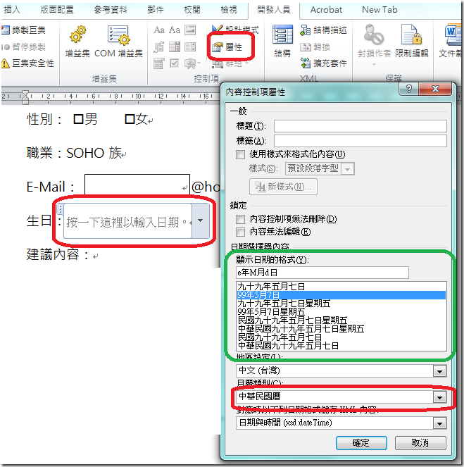 ※ 其格式設定可進入 [ 屬性 ] 中進行設定。如果你的月曆類型不想用西曆,可改選成中華民國曆,如上